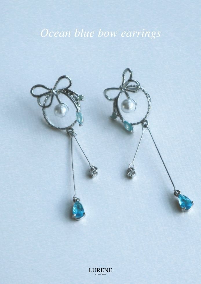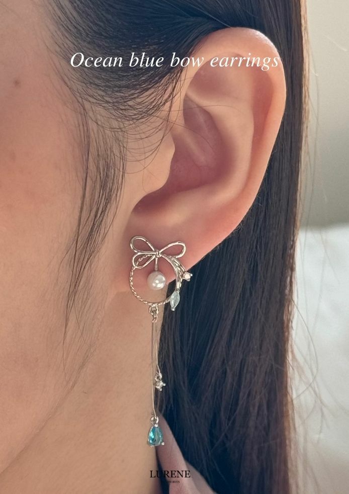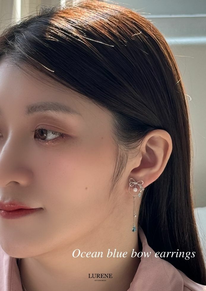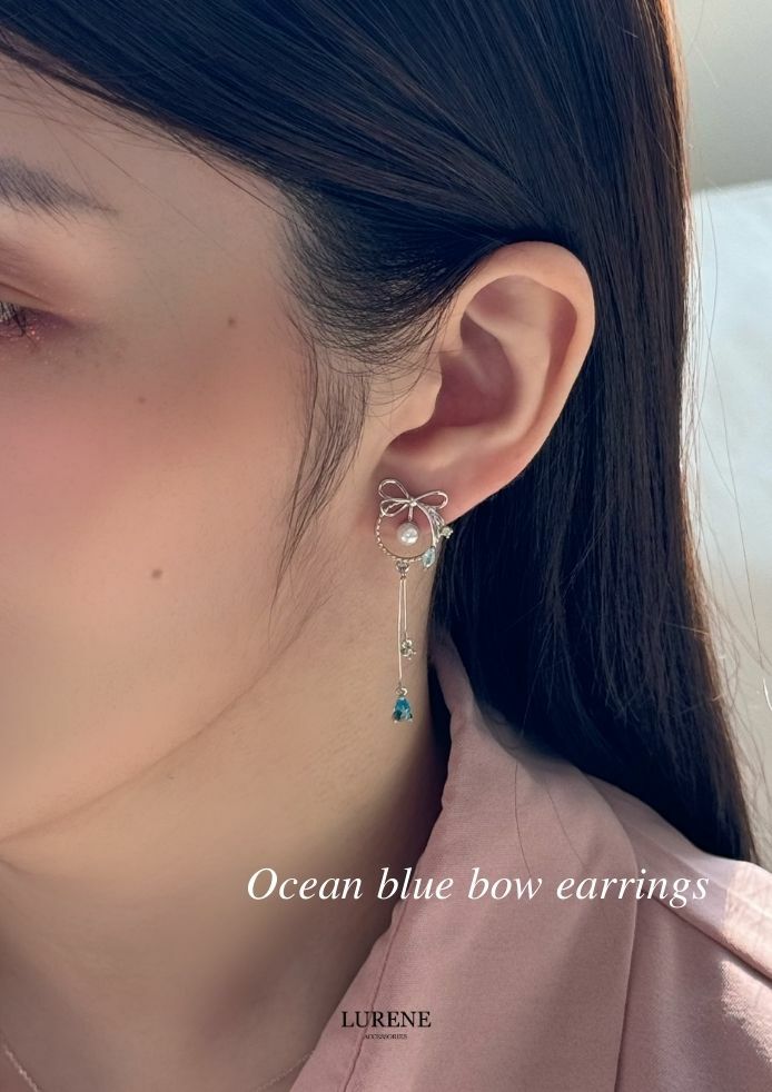 純銀耳針 Ocean碧藍蝴蝶結吊墜耳環